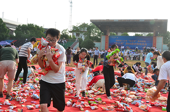 田徑場上,全體學(xué)生按班級列隊(duì),圍成了一個(gè)巨大的圓圈,圈內(nèi)則是堆積如山的零食,色彩斑斕,種類繁多,宛如一座五彩斑斕的“零食山”,引得眾人垂涎欲滴。