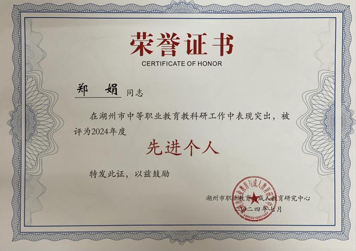近日,經(jīng)湖州市職業(yè)教育與成人教育研究中心評定,浙江省湖州藝術(shù)與設(shè)計學(xué)校榮獲中職教科研工作2024年度先進(jìn)集體,鄭娟老師喜獲2024年度先進(jìn)個人。