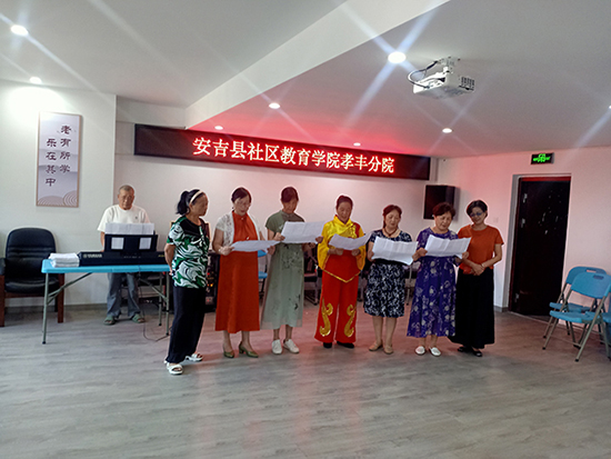 石永明學(xué)員負(fù)責(zé)的節(jié)目是小組合唱,兩首歌曲《最美的鄉(xiāng)村,最美的家》和《天目山上哎杜鵑花》都是石永明學(xué)員親自作詞作曲。歌曲反映孝豐革命老區(qū)在新時(shí)代鄉(xiāng)村建設(shè)中所取得的巨大成就。胡彩芳學(xué)員在身體欠佳的情況下依然為排練越劇《相遇》《十八里相送》忙前忙后。她無(wú)比自豪地說(shuō):“偉大的祖國(guó)蒸蒸日上,給了我們熱情和動(dòng)力。”
