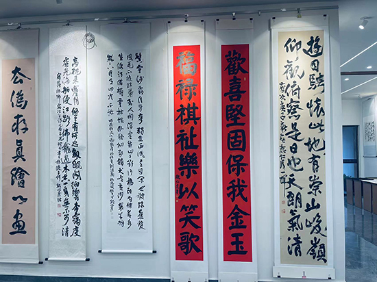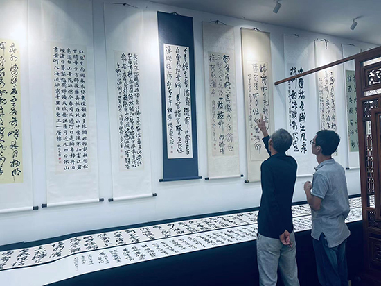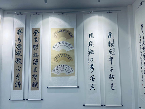 近200位來自諸暨市楓江書畫社、諸暨三賢研究會、諸暨市古越書畫院的社員和書法愛好者及親朋好友觀展,近距離欣賞魏仁虎的書法作品。四周墻壁上掛滿了大大小小尺幅、真草篆隸字體的100余幅多種形式的書法作品,條幅、楹聯、手卷、中堂、扇面、條屏等應有盡有,或娟秀的小楷,或恢宏的大字或流暢的行書,滿眼是雅致的書墨氣息,讓人沉浸在粗細筆畫、輕重筆力、疏密空間、濃淡墨味的書法海洋中,尤其是一樓西側擺放在桌子上的兩幅長卷,吸引眾位圍觀賞鑒,對魏仁虎一氣呵成、大氣磅礴、老到嫻熟地書寫贊美有加。