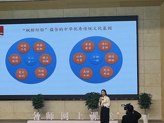 馮國利圍繞《新時代“楓橋經驗”賦能中小學德育教育》主題,就“楓橋經驗”展開講解。1963年,中共中央決定在全國農村普遍開展社會主義教育運動,楓橋結合當地實際,提出了“不要武斗,要文斗”的教育模式,取得了良好效果,毛澤東主席批示在全國推廣。“楓橋經驗”的發展。在新的時代形勢下,“楓橋經驗”對維護社會穩定具有積極的意義,得到了以習近平總書記為代表的中央黨政機關的認可,要求繼續推進發展。馮國利還重點介紹“楓橋經驗”賦能中小學德育教育的具體理論。剖析了當前德育教育中存在的四個主要問題:家庭德育教育效能不足;升學壓力導致學校德育時間被擠壓;信息多元化導致價值觀多元;學生沒有充分認識到德育教育的重要性。馮國利結合“楓橋經驗”的具體理念,提出了相應的解決思路,給予聽課師生有益的啟發,明晰了“楓橋經驗”。