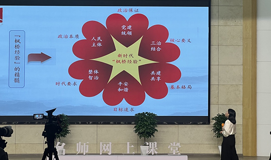 在連線環節,紹興市建功中學的學生詢問過去的“楓橋經驗”和新時代的“楓橋經驗”區別和變化是什么?馮國利解答:過去的“楓橋經驗”主要是為了改造四類分子,新時代的“楓橋經驗”則涉及黨建統領、三治結合、共建共享等。上虞外國語學校的學生問詢如何運用“楓橋經驗”處理、解決同學矛盾,馮國利給予了積極地引導。楓橋鎮初級中學的學生好奇于“楓橋經驗”為什么歷久彌新,馮國利從楓橋的文化底蘊和中華傳統文化的角度作解答。當學生提出“如何建設富有楓橋特色的校園文化”時,馮國利結合楓橋經驗“訴源治理”特點,提出了“合力營造共建共治共享的和諧校園氛圍”的出路。馮國利針對學生提出青春期親子關系問題,諄諄教誨,建議學生做好該做的事情,與父母多溝通,以理服人,營造良好的親子關系,安然度過青春期,成為更優秀的自己。