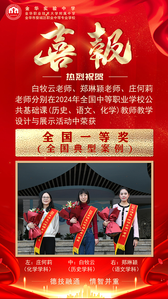 本次活動(dòng)由教育部職業(yè)教育發(fā)展中心主辦、高等教育出版社承辦,來(lái)自全國(guó)各地區(qū)中職學(xué)校134名教師參加語(yǔ)文學(xué)科展示活動(dòng),101名教師參加歷史學(xué)科展示活動(dòng),54名教師參加化學(xué)學(xué)科展示活動(dòng)。歷經(jīng)層層選拔,金華實(shí)驗(yàn)中學(xué)白牧云(歷史)、鄭琳穎(語(yǔ)文)、莊何莉(化學(xué))老師代表浙江省出征,經(jīng)過(guò)教學(xué)設(shè)計(jì)方案、教學(xué)課件、課堂實(shí)錄、微課、現(xiàn)場(chǎng)說(shuō)課及答辯等環(huán)節(jié)的激烈角逐,在參賽選手中脫穎而出全部榮獲國(guó)賽一等獎(jiǎng),并入選全國(guó)中等職業(yè)學(xué)校公共基礎(chǔ)課教師教學(xué)設(shè)計(jì)典型案例,將在智慧職教平臺(tái)向全國(guó)職業(yè)院校交流展示。其中,白牧云老師更是作為全國(guó)一等獎(jiǎng)第一名代表在閉幕式上進(jìn)行了展示。