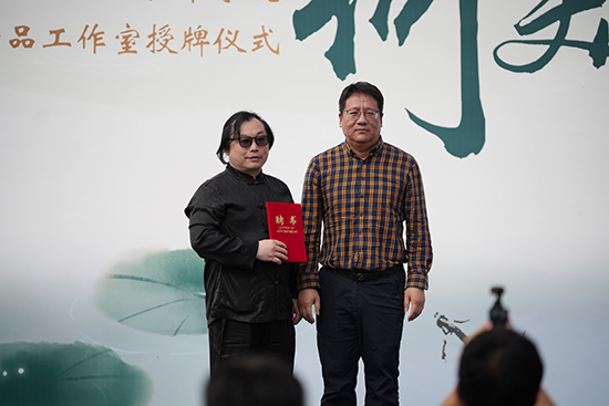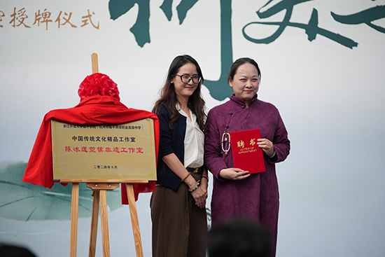 臨平區(qū)教育發(fā)展研究學(xué)院院長方建勝、浙江省民族管弦樂協(xié)會箜篌專業(yè)委員會副會長吳瀟瀟,為陳冰蓮箜篌非遺工作室授牌。