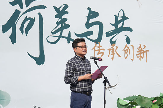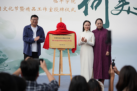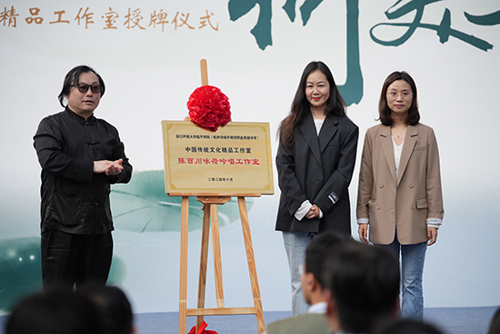 教育局團工委書記沈怡飛,浙江省朗誦協(xié)會理事、臨平區(qū)朗誦協(xié)會主席初苗,為陳百川詠荷吟唱工作室揭牌。