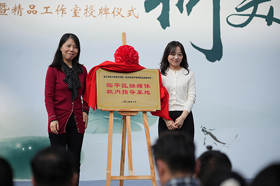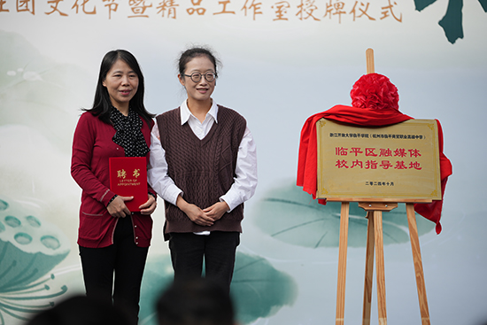 臨平區(qū)南苑街道公共服務(wù)辦公室主任沈丹萍,臨平區(qū)融媒體中心黨委委員、中心領(lǐng)導(dǎo)部副主任錢宇,為臨平區(qū)融媒體校內(nèi)指導(dǎo)基地揭牌。