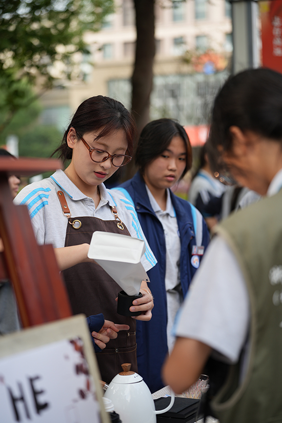 蔣萊老師指導(dǎo)的荷你手沖咖啡社讓咖啡香彌漫學(xué)校的主干道,學(xué)生通過磨咖啡豆、手沖等環(huán)節(jié)體驗到制作咖啡的樂趣。