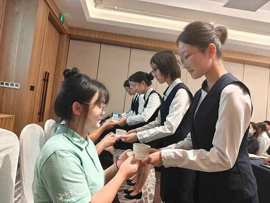 新生班學生代表向企業師傅進行奉茶以示感謝。敬茶儀式的舉行是表達學生對師長的敬意與感激,象征著弟子們虛心接受知識的心態和追求學術品德的高度,進一步增強職業意識,升華師徒感情。
