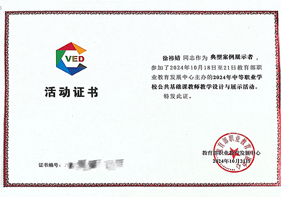 近日,由教育部職業教育發展中心主辦的2024年中等職業學校公共基礎課教師教學設計與展示交流活動在西安落下帷幕,全國共有1000多名教師參加展示活動。衢州第二中等專業學校徐祎婧老師在133位選手參加的思想政治組教學設計展示中表現優異,獲得評委的一致好評,其參賽作品入選全國中等職業學校公共基礎課教師教學設計典型示范案例(一等獎)。