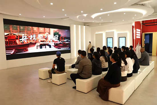 在前廳的紅船模型前,范曉春帶領黨員教師們重溫入黨誓詞。范曉春領誓,兩位黨員教師手舉黨旗,全體黨員高舉右拳,莊嚴宣誓。