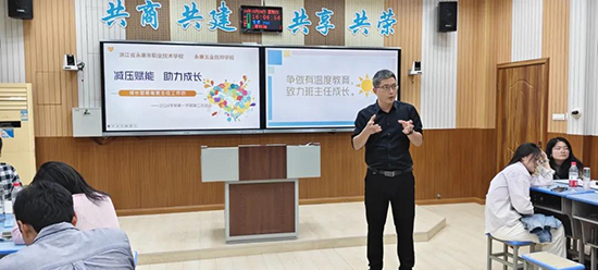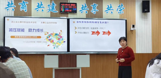 在輕松愉快的氛圍中,周深《小美滿》的旋律緩緩響起,為成長型思維班主任工作坊2024學年第一學期第二次活動拉開了序幕。本次活動由永康職技校王琛雲老師主持,應江泚老師主講,副院長朱新波蒞臨指導、全程參與,旨在通過交流與分享,為班主任們減壓賦能,助力他們在教育教學的道路上不斷成長。