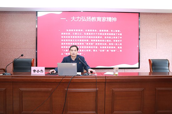 在完成“第一議題”學(xué)習(xí)后,章小杰為全體黨員做了主題為“大力弘揚(yáng)教育家精神,加快建設(shè)教育強(qiáng)國(guó)”的專題黨課。