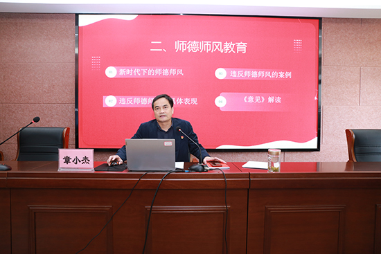 師德師風(fēng)是教育發(fā)展的基石。在黨課中,章書記解讀了師德師風(fēng)的相關(guān)文件精神,從新時(shí)代的師德師風(fēng)的變化出發(fā),用一系列的真實(shí)案例警示廣大黨員教師,應(yīng)廉潔自律,以身作則,為人師表,明晰紀(jì)律規(guī)矩、守牢底線,以德為本。