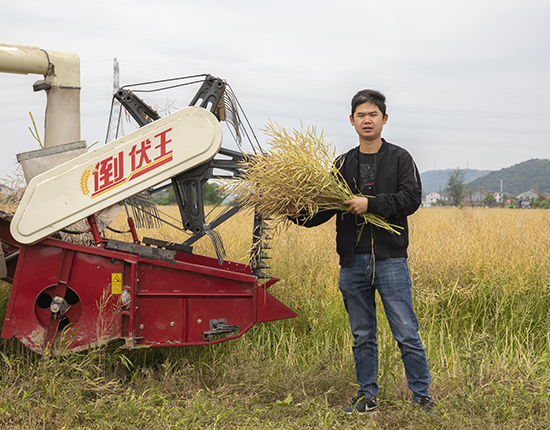 2010年他知曉政府大力扶持大學生返鄉(xiāng)創(chuàng)業(yè)后,他毅然決定離開大企業(yè)“舒適區(qū)”,回家務農創(chuàng)業(yè)。但傳統農業(yè)的局限使他渴望改變,于是在2017年進入成校高素質農民專班學習,他如魚得水,豐富的課程、高級農藝師講解令他對科學技術的掌握日益提高。學以致用,他購置了烘干機、無人插秧機、無人植保機等現代化農業(yè)機械,大大提升了農業(yè)生產的效率和收益,成了大家口中的“農機達人”,并獲得浙江省級的多項榮譽,央媒等媒體也進行廣泛報道。成功沒有讓他忘記和農民朋友一起振興鄉(xiāng)村的初心,他熱心幫助周邊農戶,解答種植難題,加入農民演說家隊伍,廣泛傳播農業(yè)知識,帶動更多的人共同富裕,將共富共美的精神落到實處。他貫徹總書記指示——“把‘藏糧于地、藏糧于技’真正落實到位。”