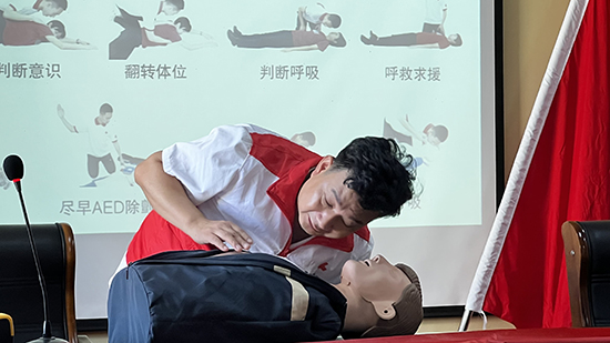終身學(xué)習(xí),授人以漁。作為基層衛(wèi)生室醫(yī)生,劉開(kāi)健發(fā)現(xiàn)每年都有幾位村民因?yàn)椴恢佬脑葱遭赖狞S金搶救時(shí)間、方式而死亡。于是他利用一年時(shí)間參加臨海市第一人民醫(yī)院同質(zhì)化培訓(xùn)、臺(tái)州市紅十字二級(jí)應(yīng)急救護(hù)師資等培訓(xùn),獲得浙江省紅十字二級(jí)應(yīng)急救護(hù)師。學(xué)以致用,回來(lái)劉開(kāi)健馬上開(kāi)展“人人學(xué)急救、急救為人人”應(yīng)急救護(hù)知識(shí)與技能宣教活動(dòng)。他加入社區(qū)學(xué)校的志愿者,進(jìn)入各個(gè)村文化禮堂,進(jìn)入中小學(xué)、工廠等,通過(guò)一場(chǎng)又一場(chǎng)的宣講,采用“理論+實(shí)操”的教學(xué)方法,講解心肺復(fù)蘇的必要性和“黃金四分鐘”,利用 PPT 將仰頭舉頜、開(kāi)放氣道、心肺復(fù)蘇、人工呼吸、復(fù)原體位等 CPR 操作步驟和相關(guān)注意事項(xiàng)進(jìn)行詳細(xì)講解,并利用模擬人手把手指導(dǎo)學(xué)生、工人、村民實(shí)踐操作,對(duì)按壓位置、力度、動(dòng)作要領(lǐng)不到位及時(shí)糾正。演示“海姆立克急救法”“常用的外傷包扎止血法”。自 2023 年以來(lái),共計(jì)開(kāi)展應(yīng)急救護(hù)講座 60 場(chǎng)次,應(yīng)急救護(hù)培訓(xùn) 6000 人次,發(fā)放宣傳資料 6000 余份。生命無(wú)價(jià)、急救有道。為提升學(xué)生、村民健康意識(shí)和自救互救能力,“宣傳者”劉開(kāi)健忙碌而快樂(lè)著!
