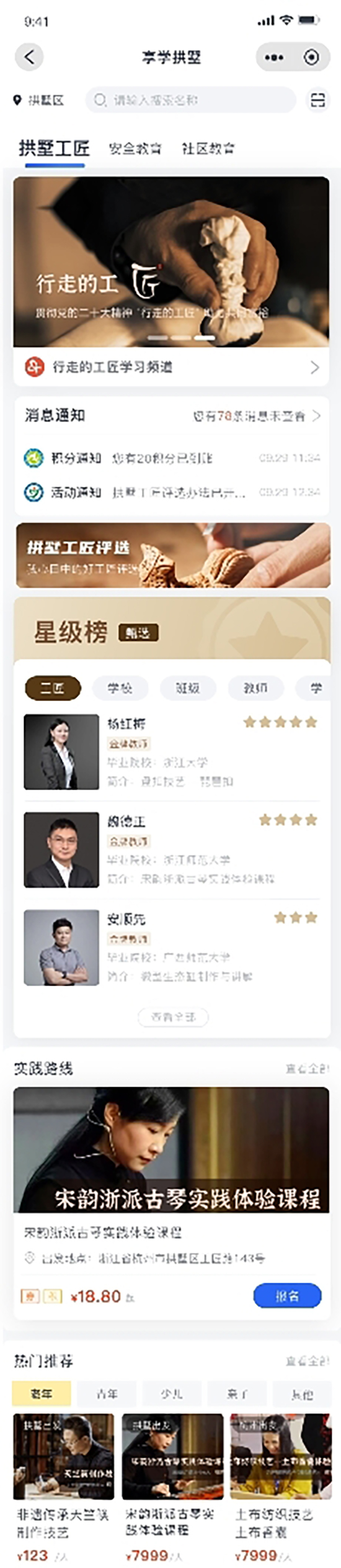 升級“享學拱墅”平臺,打造“行走的工匠”專欄。為了建成政府、家庭與社會共同參與的協同學習生態鏈和多元參與的學習共同體,學院協同杭州皆學科技有限公司優化升級了“享學拱墅”全民數字學習平臺,開辟了“行走的工匠”專欄,以五大版塊呈現。“匠心”訪談:通過對工匠訪談、傳統技藝的圖文宣傳,故事匯微視頻、專題片等,讓市民對中華優秀的工匠文化和技藝有較為全面的了解。“匠美”課堂:開設直播課,支持市民學習的隨時回放;打造線下公益課,通過平臺發布、學習者預約報名,線下簽到,體驗學習,作品發布的模式開展,讓學習更規范有序;定期發布各類工匠技藝的微課和教學視頻等,促進宣傳和推廣。“匠藝”傳習:對工匠文化終身學習體驗基地和校園傳習基地進行介紹、宣傳和推廣,擴大知名度;打造基地“深度游學”線路,開通活動發布和線上報名,破解工匠資源和市民學習需求信息不對稱的困境,為市民的終身學習提供更多更好更廣的選擇。“匠途”研學:征集并篩選優質的工匠文化傳習點,展示在“匠途”享學地圖上,市民們隨時能通過地圖搜索自己感興趣的學習點,并根據路線指引前往學習體驗;開發特色實踐活動,在“匠途”上顯示,面向全域開放,支持研學線路或活動的在線預約報名,支持社團或班級為單位的團體報名,支持線下活動的實況跟蹤和數據可視化,逐步實現研學全流程的節點數據采集和監管。“匠業”帶富:發布職業技能培訓,考證培訓等信息,征集并上架優質的工匠文創產品,可以積分兌換。
