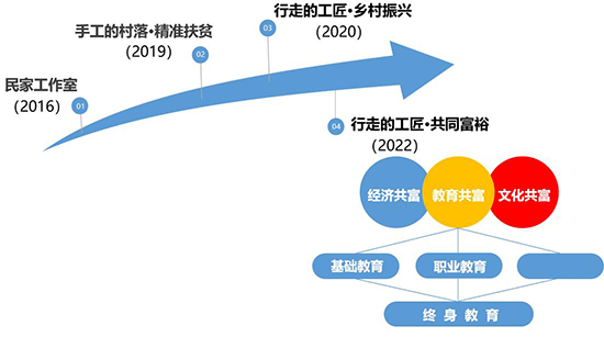 一個好的項目往往不是一蹴而就的,縱觀“民家工作室”——“手工的村落”——“行走的工匠”整個發展歷程,每一個項目都是從前一個項目中破繭而出。“手工的村落”是在“民家工作室”的培育中催生的一個新領域,將非遺手工技藝的傳承和精準扶貧聯結到了一起,并且碰撞出了絢爛的火花;而“行走的工匠”是從“民家工作室”中遴選富有精湛手工技藝的民間匠人加入到“行走的工匠”師資團隊,共同研發優質課程,通過數字化學習平臺,架起村落和城市的橋梁,面向全域全齡段市民傳播大國工匠精神,助推經濟共富的同時,實現文化共富、教育共富、精神共富。