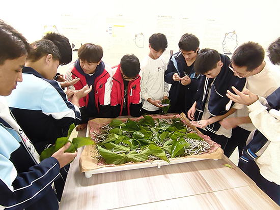 同學們興奮地圍在蠶匾周圍,一個個化身好奇寶寶,小心翼翼將桑葉喂給蠶寶寶吃。通過對蠶寶寶的觀察和輔導員老師的講解,同學們了解了蠶寶寶的生長周期和食性,體會到生命的神奇成長過程,也懂得了養蠶的艱辛與不易,學會了要尊重勞動、珍惜成果。
