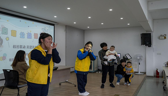 緊接著,學生志愿者們為現場的小朋友們帶來了一場精彩的音樂表演。伴隨著歡快的旋律,志愿者們帶領孩子們進行了一系列簡單而又富有節奏感的動作,如拍手、跳躍、轉圈等,不僅鍛煉了孩子們的身體協調性,也激發了他們對音樂的興趣。家長們在一旁觀看,臉上洋溢著笑容,紛紛拿出手機記錄下這些溫馨的時刻。