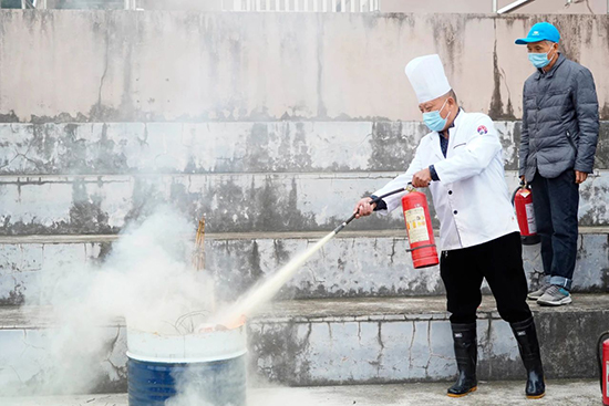 演練結束后,后勤保障處組織全體師生觀摩學習滅火器的使用操作。保障處處長姚建強介紹了滅火器的種類、適用范圍和正確使用方法,并通過模擬演示,讓師生們直觀地了解如何在火情初期時迅速、有效地進行撲救。隨后,保安、寢室管理員、實訓室管理員、食堂工作人員及學生代表依次上前實操。