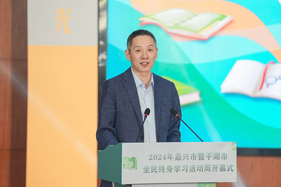 嘉興市政府副秘書長金球宣布2024年嘉興市暨平湖市全民終身學(xué)習(xí)活動(dòng)周開幕。