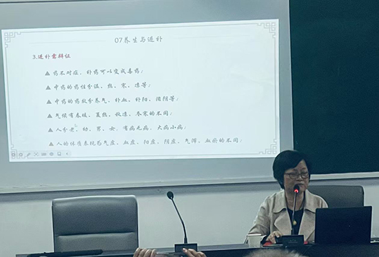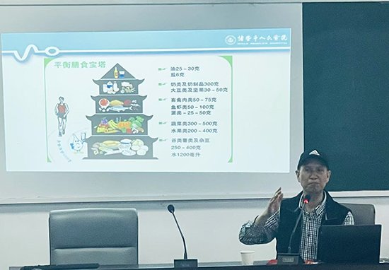 周禮萍作主題為《中醫養生保健》講座,先后講解了“長壽的特征、衰老的誘因、心理養生、飲食養生、中醫養生簡易技法、防病養生、養生與進補”等知識。“中醫養生的作用:防老、耐老、抗老;改善老化癥狀;強化體質;預防和治療常見的老年性疾病,使中老年人保持健康,或帶病延年。”奠定了基調,吸引住了在座每一位聽眾。周禮萍用詼諧生動的語言,深入淺出地講了怎樣長壽與為什么衰老。接著,著重講了心理養生與飲食養生,指出“主食多選全谷物食品、肉類優質蛋白:推薦10種;果蔬占食物量的三分之二;油脂選不飽和脂肪酸”等,當提到“喝粥養胃、喝蜂蜜水治便秘”等6種飲食養生誤區時,眾人紛紛低聲說:“網上看到未必是準確的,相信不得!”周禮萍提到中醫養生簡易技法,指導方法,當講到“少吃剩菜、不吃太燙的食物”等防病養生戒律時,令在座的唏噓不已,周禮萍告誡大家要當生活營養師,不當飼養員。