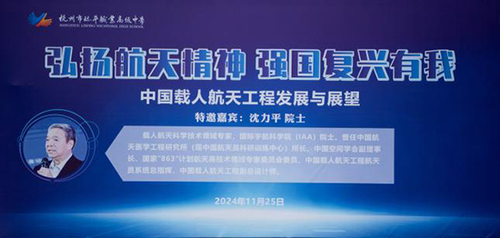 為深入學習航天精神,激發(fā)學生的愛國情懷,筑牢責任擔當,并啟迪學生的創(chuàng)新思維,凝聚團結(jié)協(xié)作向心力,以航天逐夢征程砥礪奮進之志,11月25日下午,杭州市臨平職業(yè)高級中學特邀載人航天科學技術(shù)領(lǐng)域?qū)<摇H宇航科學院(IAA)院士沈力平來校,為同學們開設了一場主題為“中國載人航天工程發(fā)展與展望”的精彩講座。本次講座采用線上+線下方式進行,各班教室設分會場,學生在任課教師組織下認真觀看直播。