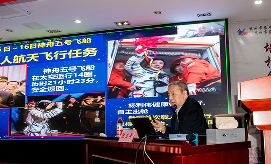 沈力平院士的講座從載人航天工程的立項及“三步走”發(fā)展戰(zhàn)略、中國載人航天工程技術(shù)體系、飛船與空間實驗室歷次飛行任務、空間站建設及在軌科學技術(shù)研究與應用、載人月球探測工程以及對未來的展望六個方面展開。