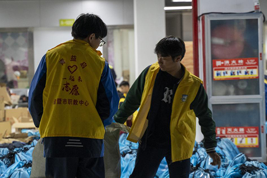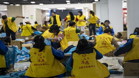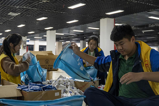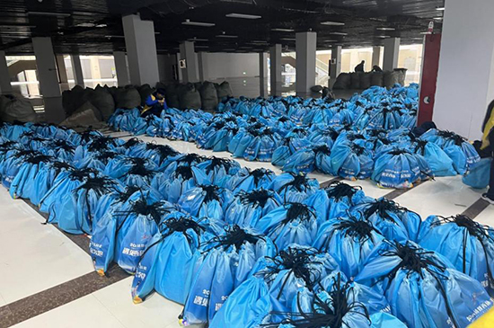 在物資分類區(qū),志愿者們將成堆的賽事背包、能量物資、賽事指南等物品按照規(guī)格和類型分門別類,整齊地擺放在地面上。接著,裝配區(qū)的志愿者們迅速而準(zhǔn)確地將其放入?yún)①惏校麄兊氖址ㄊ炀殻路鹗窃谶M行一場精心編排的舞蹈。