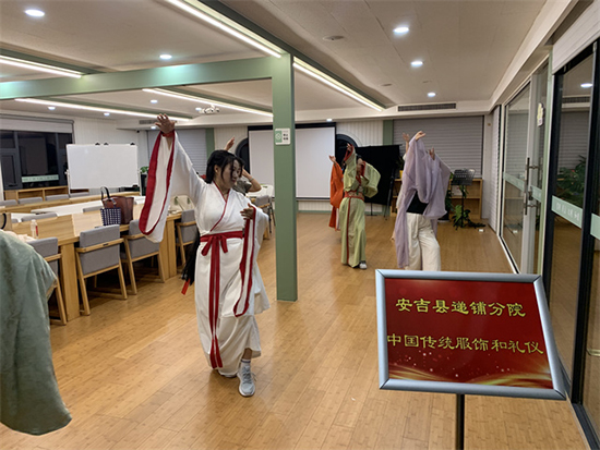 9月7日至28日,安吉縣社區教育學院遞鋪分院組織開展中國傳統服飾和禮儀系列培訓,來自轄區內各個村、社區的學員,合計110多人次參加了本期培訓,邀請了安吉縣漢服協會會長錢群等老師授課。本期中國傳統服飾和禮儀班安排了四次課程,分別是非遺漆扇體驗、手工月餅制作、拜月儀式體驗、宋制發型體驗、漢唐舞蹈《禮儀之邦》,每周六晚一次課,每次兩小時。