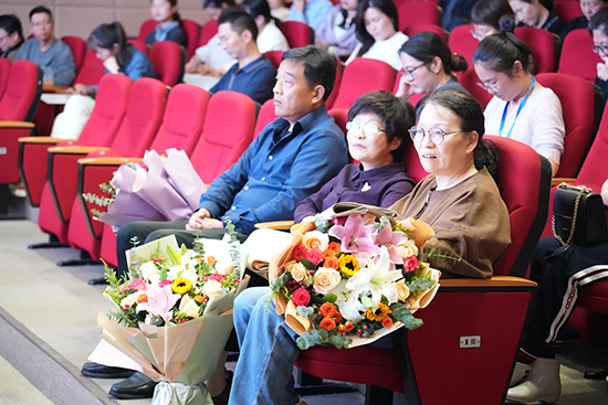 儀式開場,大屏幕播放了致敬退休老師的贈語,凝練地總結了他們對教育的熱忱和在崗位上的貢獻。老師們眼中滿是感慨與不舍。在一片溫暖而深情的氛圍中,陳榮校長和林芳副校長向到場的周辰善、錢瑛、張雋瑾三位老師送上了鮮花以及由前任校長陳劍峰親筆書寫的學校的贈語對聯,以此向他們多年來的辛勤工作表示肯定和感謝。