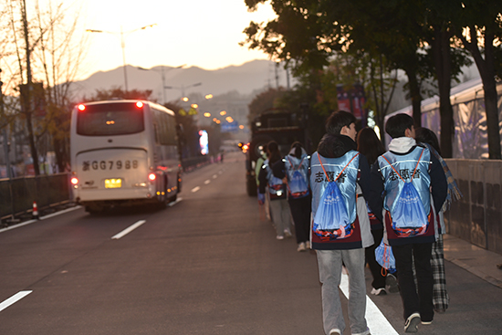 12月1日凌晨四點,昏暗的天光掩不住志愿者們因激動而閃爍的眸光。在朱新波副院長與各二級學院帶隊老師的組織下,441名志愿者有序在學校食堂前廣場集合,列隊登上前往方巖馬拉松比賽現場的大巴車。