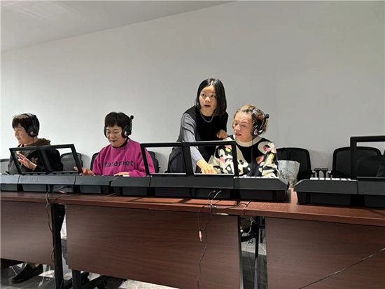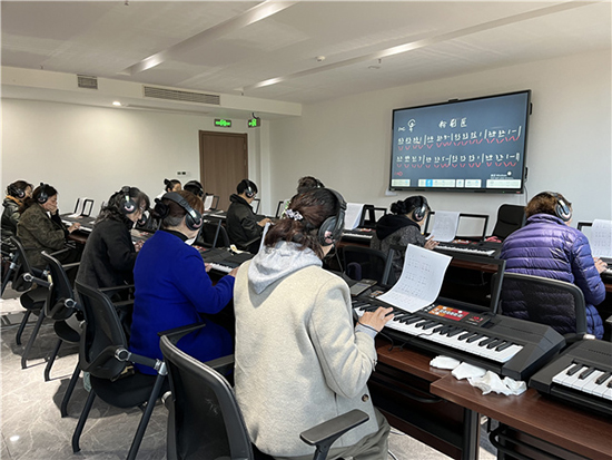 上午,學員們都早早地來到了會議室,學校老師已經提前為學員準備了電源、插排等活動物資。老師首先讓大家了解各種音符在琴鍵上的位置、指法,并耐心地教大家識譜唱譜,每位學員都帶著對樂器彈奏的熱情積極參與到活動中,輪到實操環節,大家都很有秩序地輪流在電子琴上練習彈奏指法,對于個別學員老師會手把手地重新教導。此外,老師還現場選取歌曲進行演繹分析,指導一部分有基礎的學員演奏技巧,同時講解如何配好伴奏,整個培訓室回蕩著美妙的音樂。