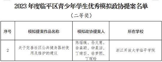 2023年臨平學(xué)院學(xué)生校外成長(zhǎng)導(dǎo)師、區(qū)政協(xié)委員金丹文和思政教師朱曉燕組成“雙導(dǎo)師”,共同指導(dǎo)學(xué)生參加模擬政協(xié)提案活動(dòng)。通過(guò)實(shí)地走訪、問(wèn)卷調(diào)查、與相關(guān)職能部門座談交流,同學(xué)們發(fā)現(xiàn)社區(qū)公共健身器材在監(jiān)管、維護(hù)上存在的問(wèn)題,并提出若干切實(shí)可行的完善建議。最終提案《關(guān)于完善社區(qū)公共健身器材使用及維護(hù)的建議》獲得全區(qū)青少年學(xué)生優(yōu)秀模擬政協(xié)提案二等獎(jiǎng)。