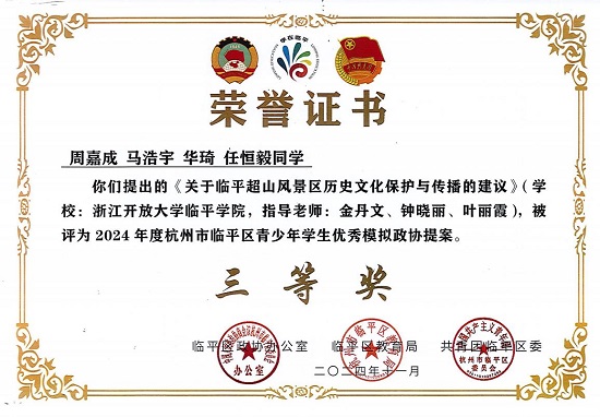 2024年臨平學(xué)院學(xué)生校外成長(zhǎng)導(dǎo)師、區(qū)政協(xié)委員金丹文和思政教師鐘曉麗、葉麗霞,繼續(xù)指導(dǎo)學(xué)生參加模擬政協(xié)提案活動(dòng),通過(guò)深入調(diào)研,提出提案《關(guān)于臨平超山風(fēng)景區(qū)歷史文化保護(hù)與傳播的建議》,對(duì)當(dāng)前超山風(fēng)景區(qū)歷史文化保護(hù)與傳播方面存在的問(wèn)題提出了一些具體可操作的建議,提案最終獲得區(qū)級(jí)三等獎(jiǎng)。