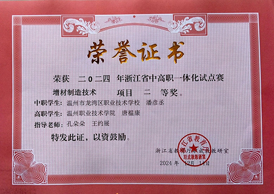 剛剛結束的2024年全省中高職一體化試點賽“增材制造技術”項目比賽傳來佳訊,由龍灣職教集團23機械溫職院3+2班潘彥丞與溫州職業技術學院唐榅康(曾是學校21機械溫職院3+2班學生)兩位同學組成的參賽隊伍喜獲省二等獎!指導老師:王約展、孔朵朵。