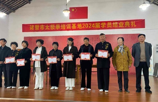 11月30日上午,諸暨市王冕太極拳培訓基地2024屆學員順利結業,典禮在楓橋鎮櫟橋村文化禮堂隆重舉行。諸暨市武術協會秘書長酈麗君,副秘書長陳小鳳,楓橋鎮老年體協主席葛世良,軒德諸暨太極隊吳佩瑜、孫竟筠、樓水文、吳滿愛4位老師應邀出席了活動。
