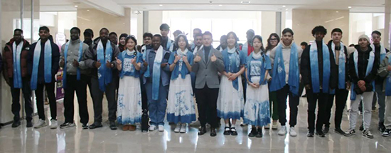 永康五金技師學院靛青白花藍染永康市非遺傳承教學基地負責人呂秀輝老師,帶領學生們將親手制作的藍染花布圍巾贈予留學生們作為紀念。每條圍巾上的百合花圖案,象征著合作共贏、幸福美滿,傳遞著美好的祝福。