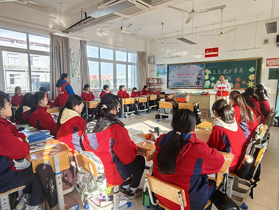 “胸外心臟按壓深度5—6cm,頻率100—120次/分,隨后開放氣道、清除異物……”北侖區紅十字應急救護師賀開盛老師正在向學校師生開展生命應急知識培訓。