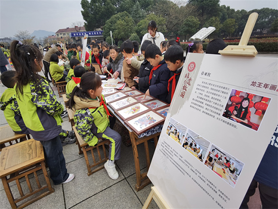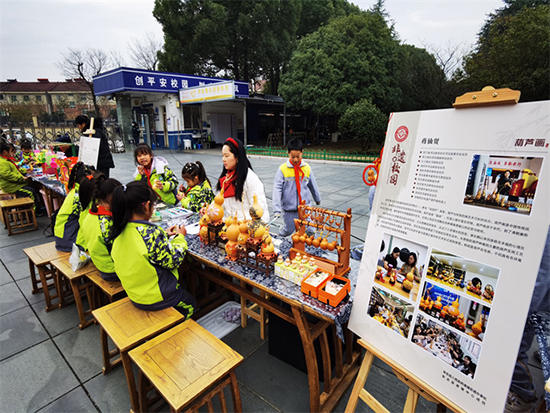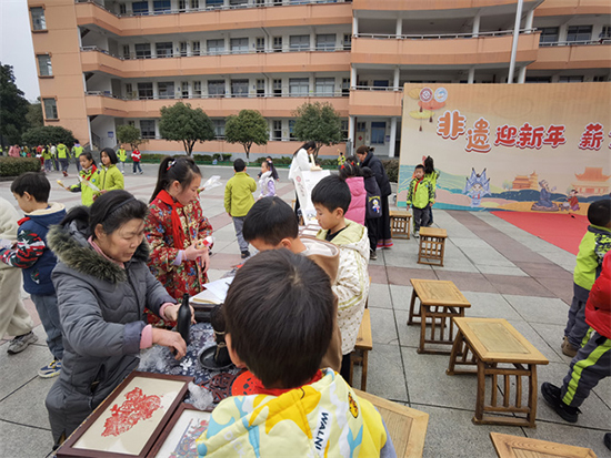 棕葉在傳承人手中上下翻飛,片刻間便化作一只只靈動(dòng)的昆蟲(chóng)、精巧的花朵,棕葉編的奇妙讓孩子們驚嘆不已;竹條在竹編藝人的指尖靈活穿梭,編織出精致的容器和圖案,那細(xì)膩的工藝彰顯著竹鄉(xiāng)的智慧;葫蘆上筆走龍蛇,一幅幅色彩斑斕、寓意吉祥的葫蘆畫誕生,承載著古老的民俗風(fēng)情;剪刀開(kāi)合,紙屑紛揚(yáng),剪紙藝人手中的紙變幻成各種喜慶的圖案,訴說(shuō)著民間的故事;面團(tuán)在捏面人師傅的巧手下,變成了栩栩如生的人物和動(dòng)物,仿佛被賦予了生命;年畫藝人用鮮艷的色彩和古樸的線條,勾勒出充滿年味的畫面,傳遞著新春的祝福;茶果子散發(fā)著淡雅的茶香和甜香,展現(xiàn)著獨(dú)特的地方風(fēng)味;糖畫師傅以勺為筆,以糖為墨,繪制出晶瑩剔透的甜蜜童話;紙?jiān)鸁艋\照亮了非遺傳承的道路,糊紙、繪畫、裝飾,每一步都蘊(yùn)含著匠心;畬族彩帶編織著民族的記憶,絢麗的色彩和復(fù)雜的花紋交織出獨(dú)特的文化符號(hào)。這些非遺項(xiàng)目宛如一扇扇通往傳統(tǒng)文化寶庫(kù)的大門,讓孩子們得以一窺其中的奧秘,也讓中國(guó)故事在校園里鮮活起來(lái)。