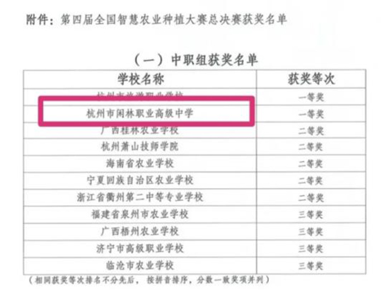 為推動數字農業、智慧農業在農業職業教育教學改革中的應用創新,推進“崗課賽證”融通育人模式,培養高素質高質量農業技術技能人才。中國農業出版社有限公司、中國職教學會現代農業職業技術教育專業委員會、中國都市農業職業職教集團、中國現代農業裝備職教集團和四維生態科技(杭州)有限公司共同舉辦的第四屆全國職業院校智慧農業種植大賽,本次比賽全國共有76所院校參賽,每支參賽隊由3名學生組成。閑林職高在比賽中獲得一等獎。(杭州市閑林職業高級中學)