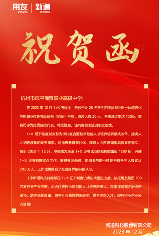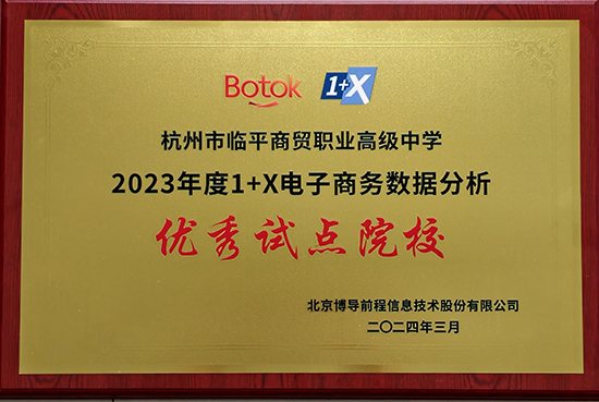 2024年度,杭州市臨平商貿職業高級中學在“1+X”證書制度試點工作中取得了驕人成績,榮獲“1+X”電子商務數據分析職業技能等級證書2023年度“優秀考核院校”“1+X”業財一體信息化應用職業技能等級證書2023年度“優秀院校”“1+X”文創產品數字化設計職業技能等級證書2023年度“優秀組織院校”,并有陳霞、董宇星兩位老師被評為2023年度“1+X”電子商務數據分析“優秀指導教師”。