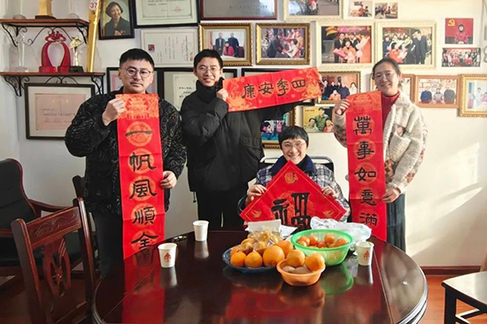 為了這場新年拜訪,學(xué)校方志堅(jiān)書法工作室的師生們特地書寫了對聯(lián)和福字,期許為阿姨家?guī)バ履甑姆諊?/p>