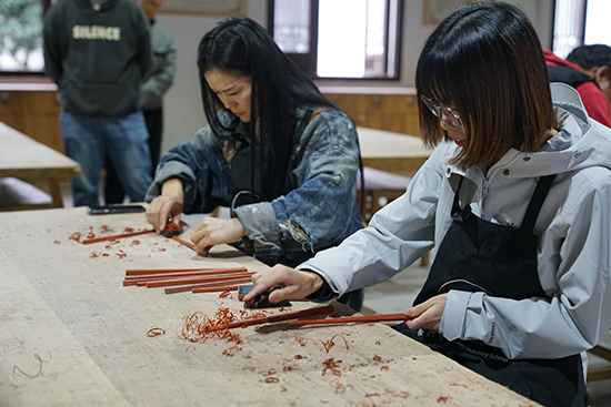 隨后,開放大學海寧學院的同學們參觀了木作工坊,學校實踐指導教師幫助同學們了解木藝作品制作使用的工具、器械,制作工藝,并講解了木筷的制作過程。同學們在教師的指導下親手打磨,體驗制作過程的艱辛和成功的快樂。