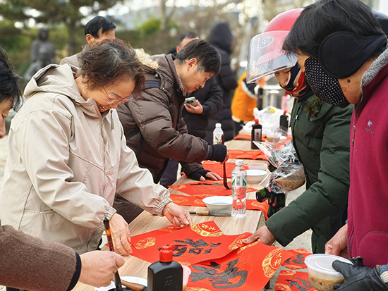 活動現場,書畫班的學員們熱情高漲,揮毫潑墨,以筆傳情,以墨寄意,將真摯的新年祝福融入到筆力遒勁的春聯與不同字體的“福”字之中,傳遞對新一年的美好祈愿。村民們精心挑選寓意吉祥的春聯與“福”字,內心的喜悅之情溢于言表,現場洋溢著新春佳節即將來臨之際的歡樂與祥和。