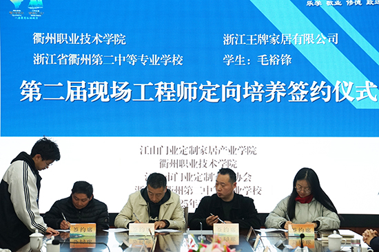 1月7日,衢州第二中等專業(yè)學(xué)校舉辦了家具設(shè)計(jì)與制作專業(yè)第二屆現(xiàn)場工程師定向培養(yǎng)簽約儀式。此次活動標(biāo)志著衢州第二中專、衢州職業(yè)技術(shù)學(xué)院與浙江王牌家居有限公司、浙江舒福家智能家居有限公司、浙江典尚木業(yè)有限公司、江山市多美歌門業(yè)有限公司深化合作,共同為家居行業(yè)培養(yǎng)專業(yè)技能扎實(shí)、綜合水平較高的現(xiàn)場工程師,以應(yīng)對行業(yè)對高素質(zhì)技術(shù)人才的迫切需求。