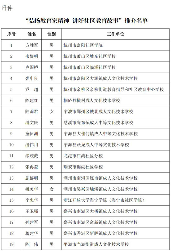 根據《關于開展“弘揚教育家精神 講好社區教育故事”推介活動的通知》(浙成職協〔2024〕11號)要求,在各地推薦和專家評審基礎上,經省成職教協會審核和公示,現將“弘揚教育家精神 講好社區教育故事”推介名單予以公布(見附件)。