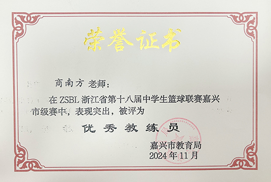 無獨有偶,學校男子籃球隊在浙江省第十八屆中學生籃球聯賽嘉興市級賽高中男子組中也取得了令人矚目的成績,榮獲第二名,商南方老師獲“優秀教練員”稱號。回顧近四年的比賽歷程,學校男子籃球隊兩次奪得冠軍,兩次收獲亞軍,始終保持著強勁的競技狀態和高水平的發揮,成為嘉興市高中學校籃球領域的一支勁旅。