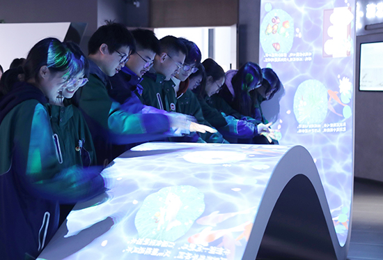 移步換景間,一行人來到大運河數字詩路e站南湖體驗中心。該館內以大運河文化為核心,借助虛擬現實、互動投影等前沿數字技術,將千年運河的歷史變遷、地理風貌、人文故事生動展現。師生一行有序參觀、積極互動,深度領略了千年運河文化的底蘊和魅力。