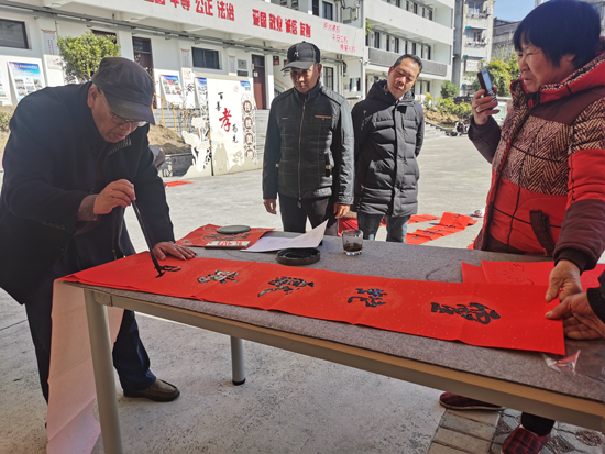 活動(dòng)現(xiàn)場(chǎng),縣書法家協(xié)會(huì)專家、學(xué)校書法社團(tuán)的部分學(xué)員以及學(xué)校的老師們齊聚一堂,在紅紙上揮毫潑墨,創(chuàng)作出一幅幅充滿節(jié)日氛圍的春聯(lián)與福字。這些作品不僅體現(xiàn)了參與者們精湛的書法技藝,更表達(dá)了他們對(duì)新年的美好祝愿。參加活動(dòng)的社區(qū)居民拿到一幅幅心怡的對(duì)聯(lián)和“福”字,笑容滿面,頻頻點(diǎn)贊說“這是實(shí)實(shí)在在的為人民服務(wù)!”